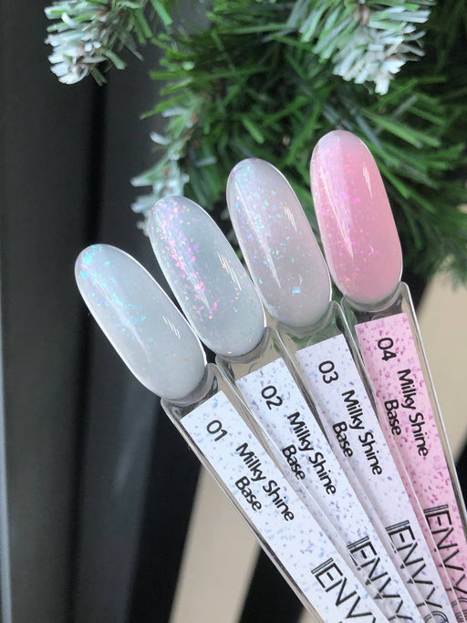 ENVY Milky Shine Base 15 ml. 01 is a semi-transparent, milky white base with a subtle shimmering/iridescent effect that gives a "milky" look. It is...