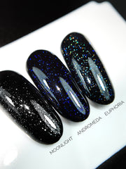 Velvet Top Andromeda (10g): A top coat with a "galaxy" effect that creates intense blue micro-shimmer on a black base; provides a deep and luminous evening look in a single coat, and stands out particularly strongly over dark tones.